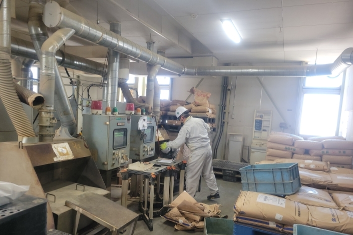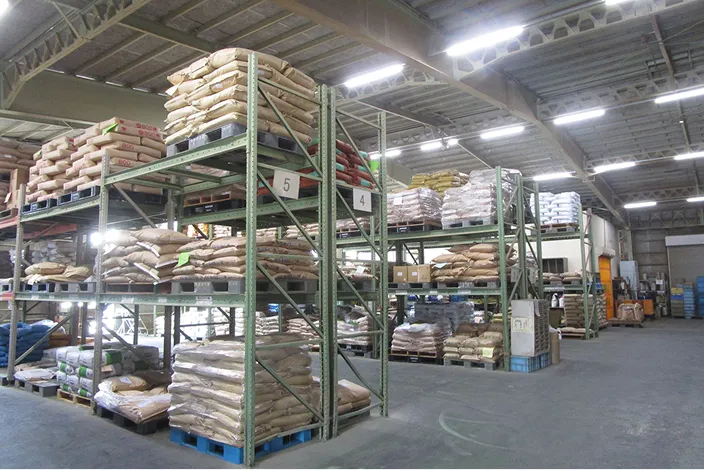 科飼研で唯一、製造しているビタミンやミネラルなどを配合したプレミックスを製造。原体加工では、高濃度の製剤原料を混合・倍散・造粒し、使いやすく高品質な製品へと加工しています。