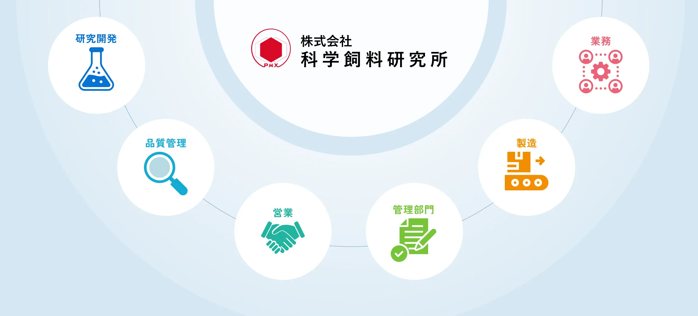 製造、営業、研究開発、品質管理、業務、管理部門の専門職種を通して、飼料・飼料添加物・動物用医薬品・動物用ワクチンなどを製造・販売するメーカーとして、お客さまの多様なニーズに対応できる体制を整え、JAグループの飼料・動物薬事業の一端を担っています。