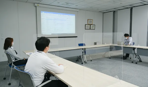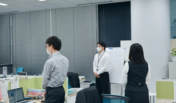 全体の朝礼後、課員と一日のスケジュールの確認を行い、自分の仕事に取り掛かります。