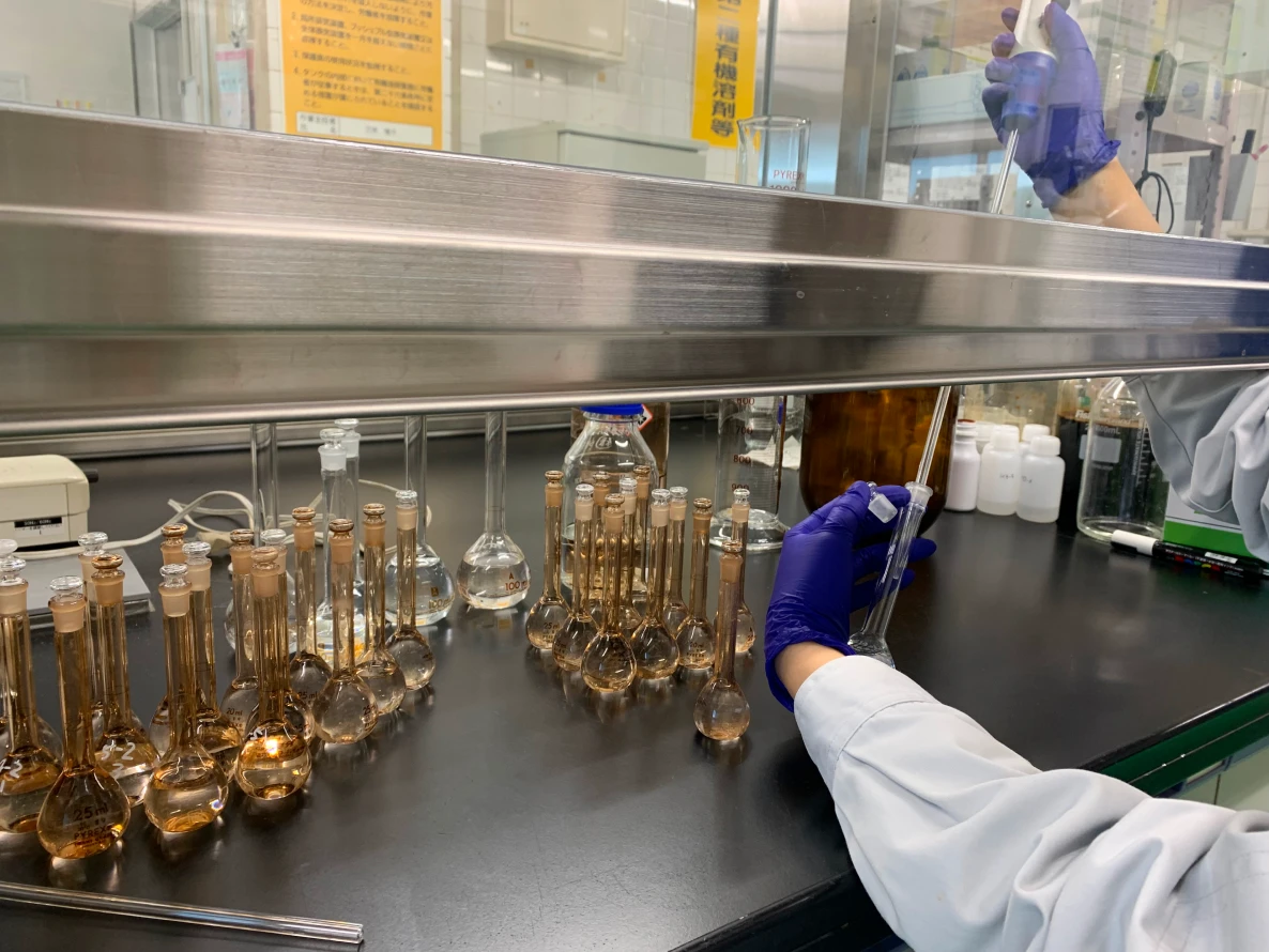 試作品は分析装置にかける前に濃度調整などの前処理を行います。