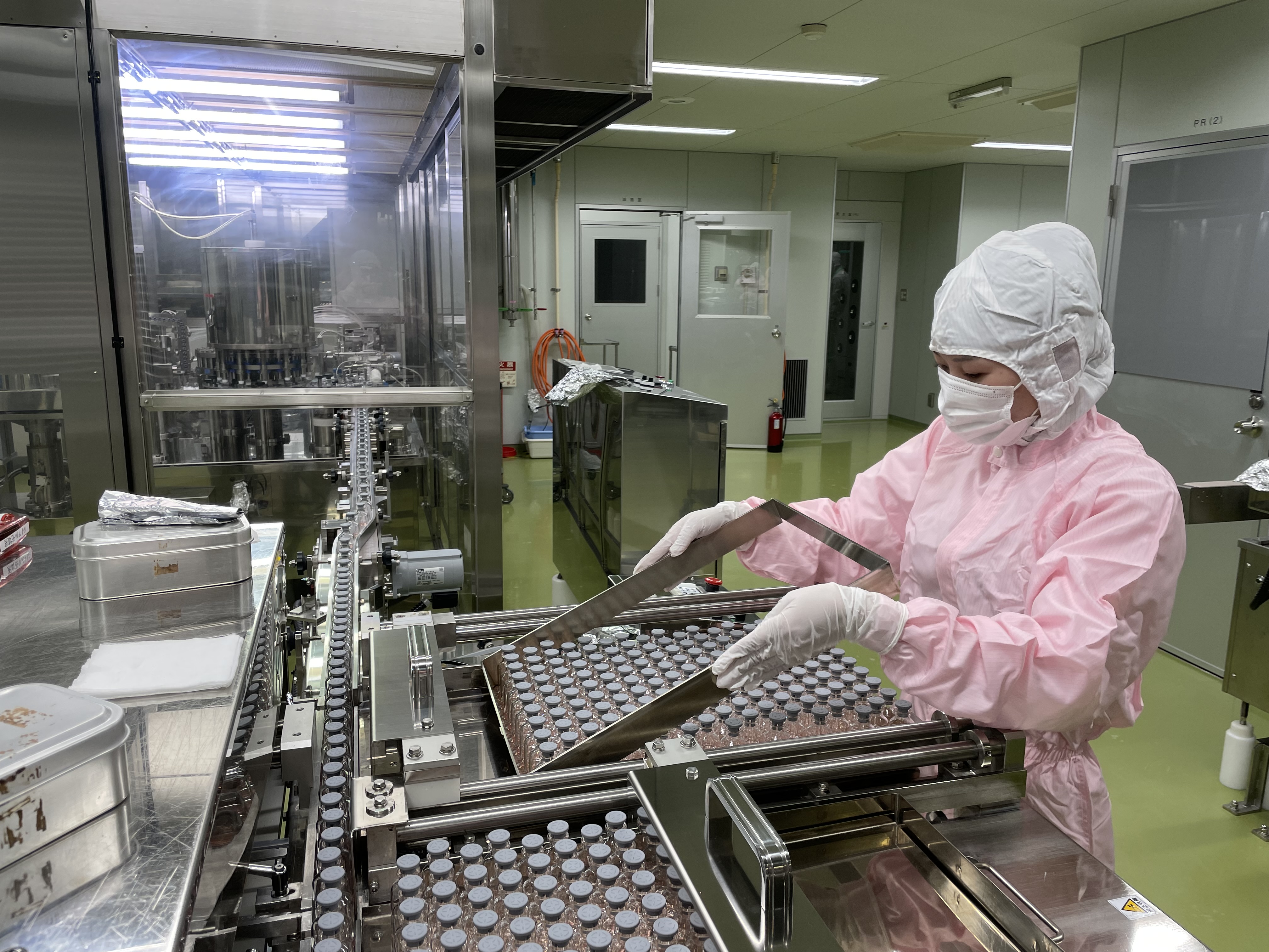 その後、凍結乾燥(フリーズドライ)を1日行ない、巻締(キャップを閉めて密閉)後に製品となります。